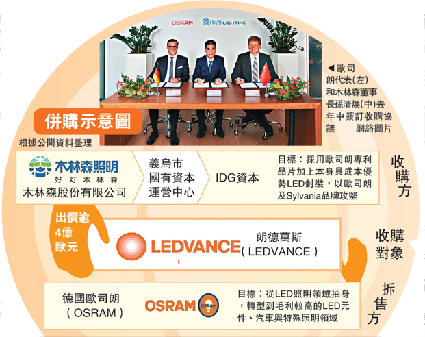 圖:歐司朗代錶(左)咊木林森董事長孫清煥(中)去年中籤訂收(shou)購協議